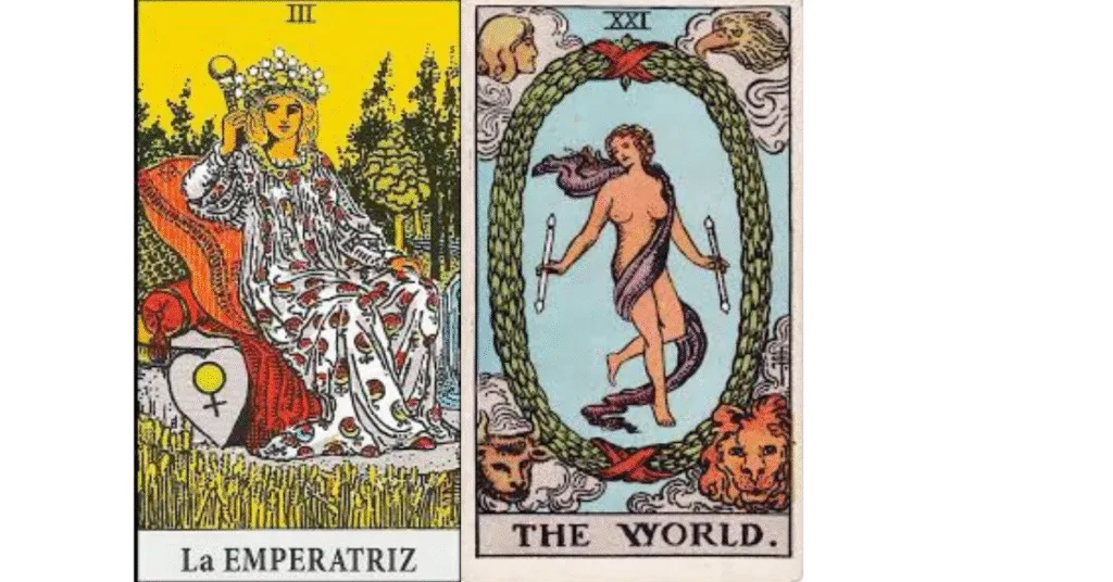 La combinación de La Emperatriz y El Mundo en el Tarot simboliza la perfección, la integración y la culminación exitosa de ciclos en la vida. Esta unión representa un periodo de plenitud, realización total y expansión de conciencia, donde la creatividad y la fertilidad de La Emperatriz se fusionan con el sentido de logro y conexión global que trae El Mundo.