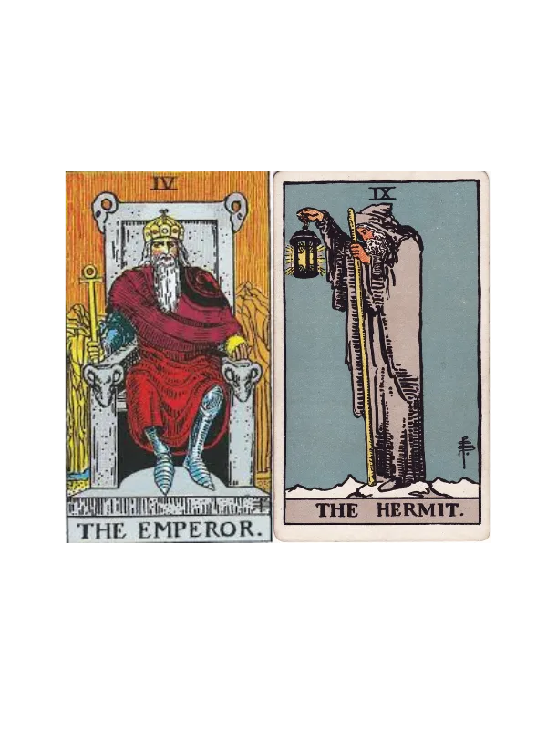 Espiritualmente, esta combinación refuerza la importancia de la introspección para alcanzar la madurez y el equilibrio. El Emperador aporta fuerza interna y estabilidad, mientras que El Ermitaño representa la luz de la sabiduría y el autoconocimiento.