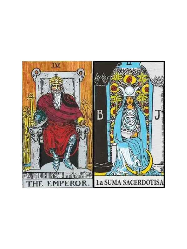 La combinación de las cartas del tarot El Emperador y La Sacerdotisa (o Papisa) representa la unión perfecta entre la autoridad, el poder estructurado y la sabiduría interior, la intuición y el misterio. Estos dos arcanos mayores, aparentemente opuestos, se complementan para ofrecer un mensaje profundo de equilibrio entre el mundo material y el espiritual, entre la mente racional y la receptividad femenina.