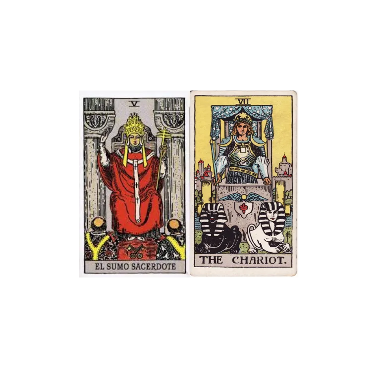 La combinación de El Sumo Sacerdote (El Papa) y El Carro en el tarot representa la unión entre la sabiduría tradicional y la fuerza de voluntad para avanzar. Juntas, estas cartas anuncian momentos de avance guiado por principios sólidos, decisiones importantes y la capacidad de superar obstáculos con disciplina y fe.