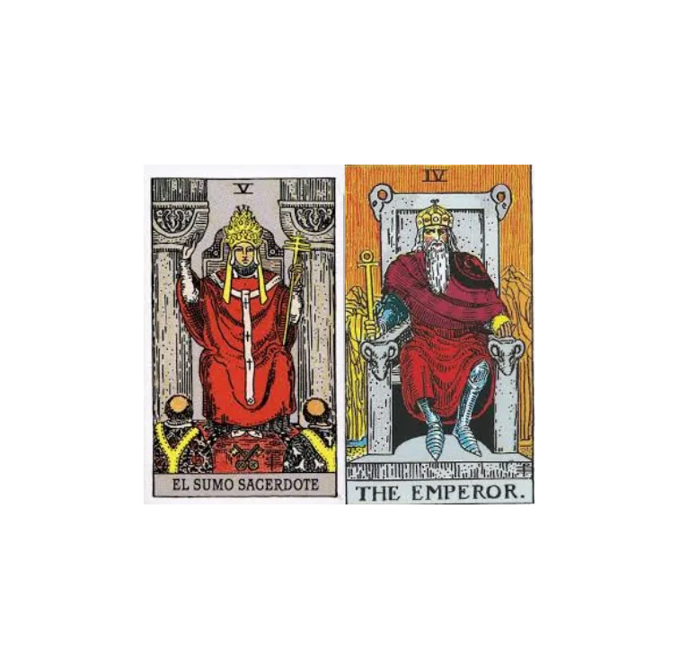 La combinación de El Sumo Sacerdote (El Papa) y El Emperador en el tarot es una de las más sólidas y estructuradas del mazo. Une la sabiduría, la tradición y la guía espiritual del Papa con la autoridad, el liderazgo y la estabilidad de El Emperador. Juntas, estas cartas anuncian momentos de consolidación, toma de decisiones firmes y la necesidad de actuar con responsabilidad y ética.