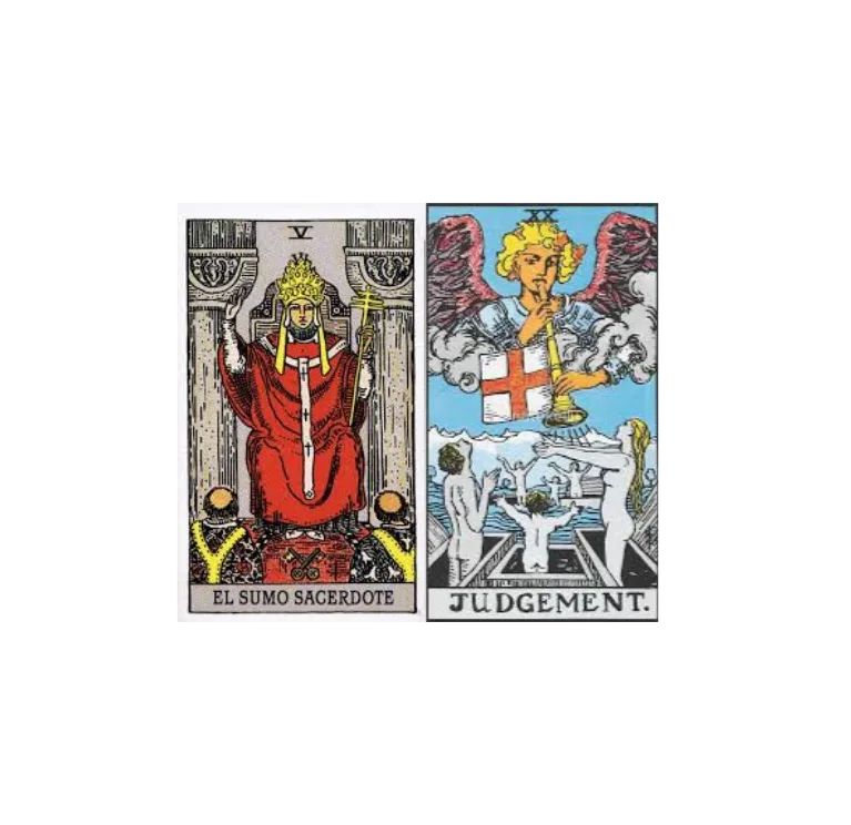 La combinación de El Sumo Sacerdote (El Papa) y El Juicio en el tarot une la sabiduría, la tradición y la guía espiritual del Papa con la renovación, el despertar y las decisiones trascendentales que representa El Juicio. Juntas, estas cartas anuncian momentos de revelación, oportunidades para redimir errores del pasado y la posibilidad de iniciar una nueva etapa con mayor conciencia y claridad.