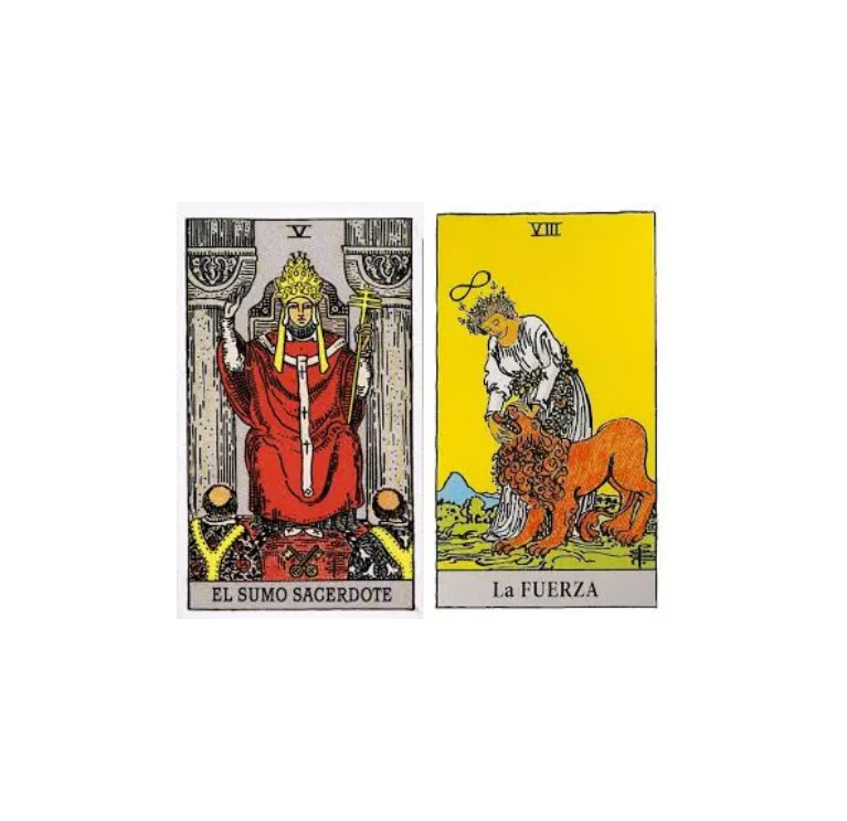 La combinación de El Sumo Sacerdote (El Papa) y La Fuerza en el tarot une la sabiduría tradicional, la guía espiritual y la ética del Papa con la valentía, el autocontrol y la energía vital de La Fuerza. Juntas, estas cartas anuncian momentos de superación personal, dominio de los instintos y la capacidad de enfrentar desafíos con integridad y coraje.