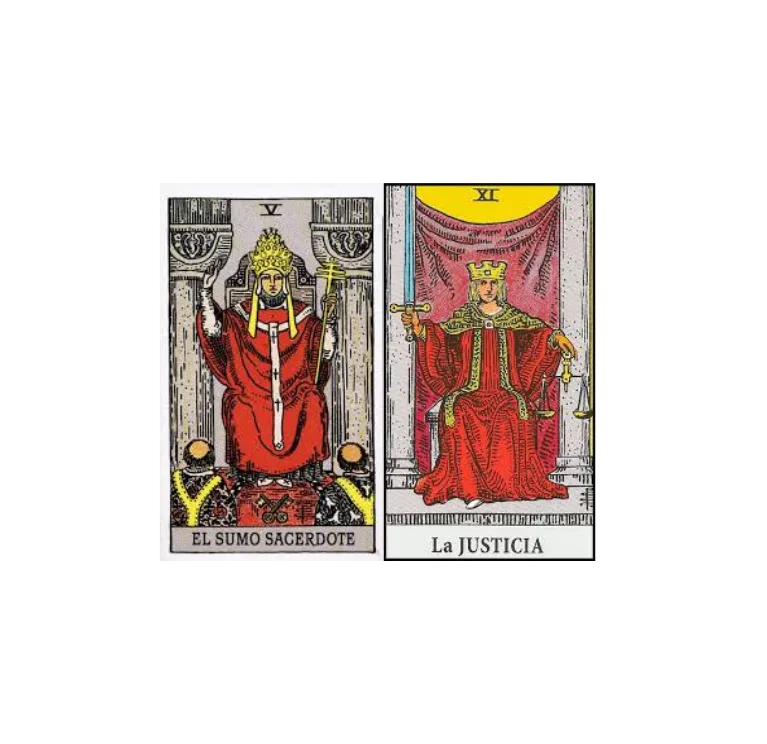 La combinación de El Sumo Sacerdote (El Papa) y La Justicia en el tarot une la sabiduría, la ética y la tradición del Papa con el equilibrio, la imparcialidad y la búsqueda de la verdad de La Justicia. Juntas, estas cartas anuncian momentos en los que la integridad, la honestidad y la toma de decisiones justas serán fundamentales para avanzar en cualquier aspecto de la vida.